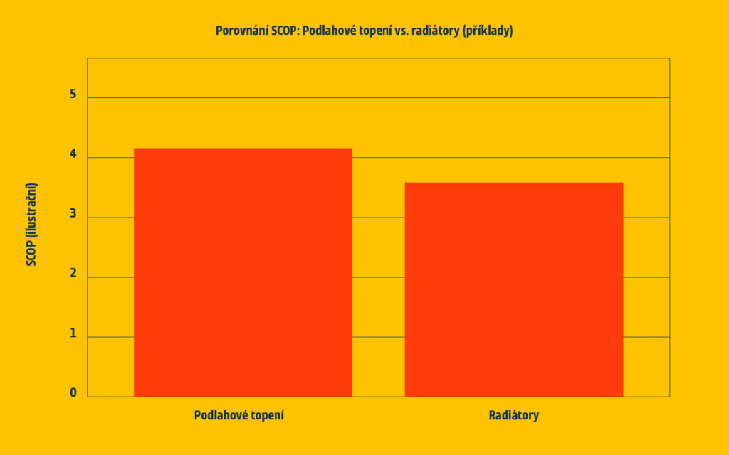 Optimální výstupní teplota: Pro maximální efektivitu by měly být nastaveny co nejnižší výstupní teploty topné vody (ideálně nižší než 50 °C). Podlahové vytápění může dosahovat výstupních teplot kolem 35 °C a vratných teplot 28 °C bez nutnosti dalších úprav.